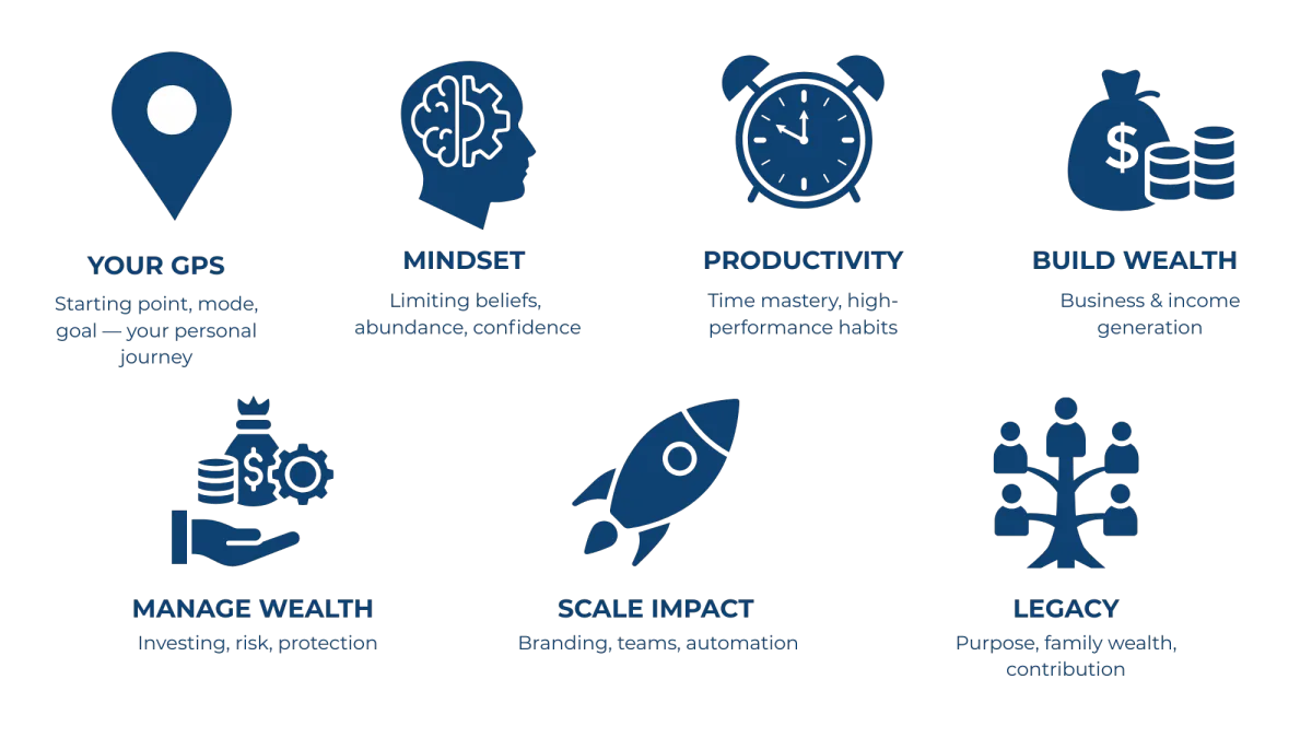 Imagine knowing exactly where you stand financially — and having a clear, actionable roadmap to take you where you want to go. On Day One, our experts will guide you through proven frameworks to pinpoint your current position, set powerful wealth goals, and chart your course to lasting financial freedom.